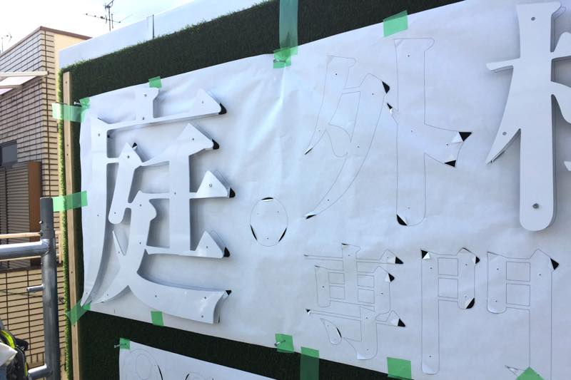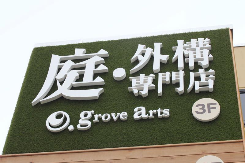 庭・外構の専門店「株式会社グローヴアーツ」様の業務拡大に伴い、和泉市に移転オープンの店舗外観サインを手がけさせていただきました。ガーデンのグリーンを連想させるためにベースに人工芝を使用し、やわらかな芝生に文字が浮き出ている立体的な演出を採用しました。