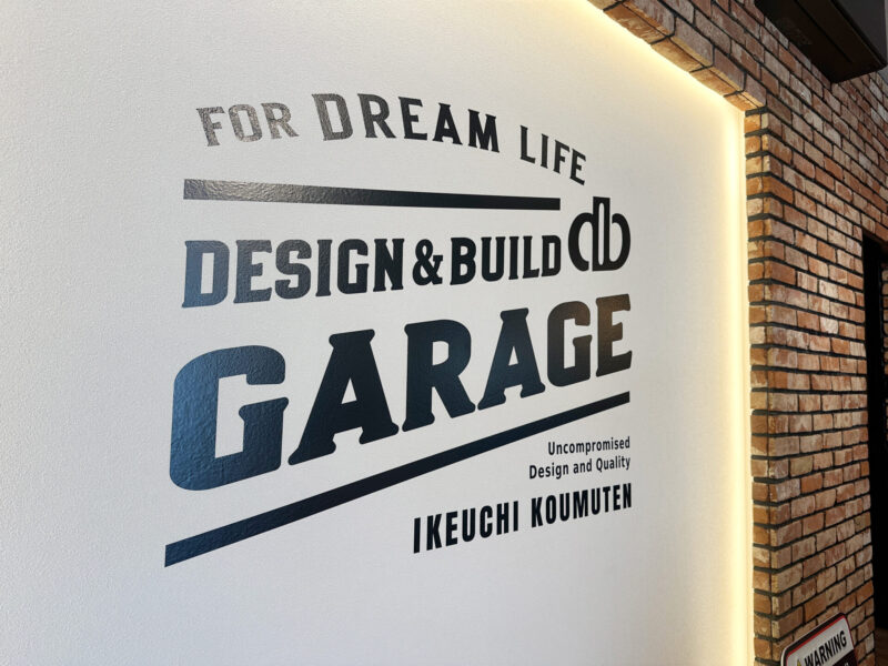 池内工務店さんのコンセプト「design & build」を今回のガレージルーム用にロゴデザインさせて頂き、ガレージショールーム空間にマッチするコンセプトサインをご依頼頂きました。